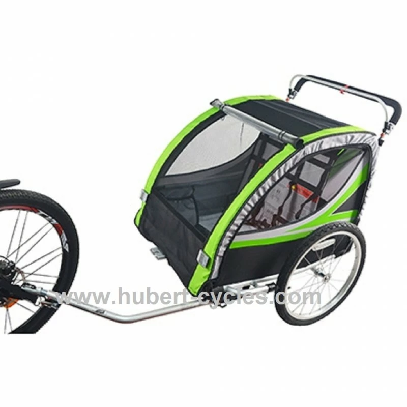 REMORQUE VELO ENFANT – POUSSETTE COUVERTE 2 PLACES EN ALU MAXI 36Kg COLORI VERT AVEC ROUES 20″ -FIXATION AXE DE ROUE – LIVRE AVEC ROUE AVANT ET POIGNEE FREIN – MONTAGE RAPIDE SANS OUTIL